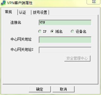 安装完成后点击桌面vpn-client图标打开vpn连接管理器(如上图),点击界面中的“VPN”,在首次连接时先点击“属性”进行设置,在属性界面选择“域名”,在中心网关地址中写上VPN服务器的域名;